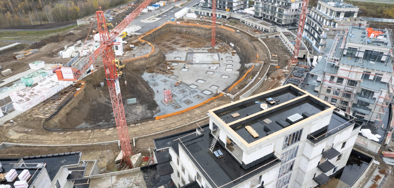 As part of the second phase for buildings G,H,I, the excavation work is complete and the foundation slab is being poured.